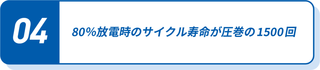 ISO9001およびISO14001などの世界認証を多数取得し、厳格な品質管理のもとで製造されており、80%放電を繰り返してもサイクル寿命が約1500回と、国産バッテリーと同等の高寿命を実現しています。