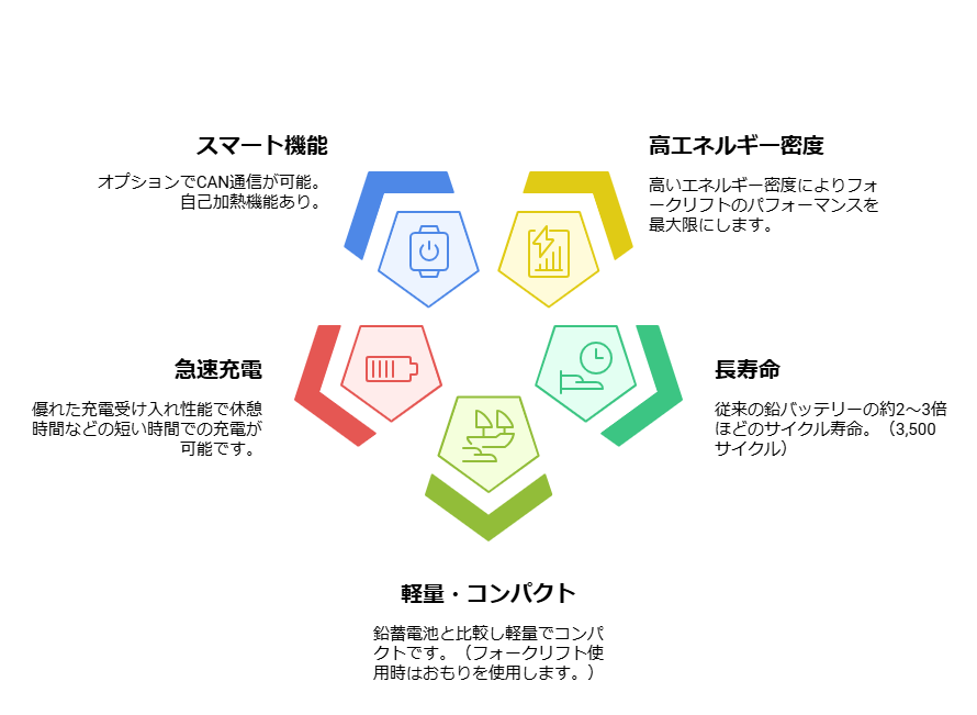 フォークリフトリチウムイオンバッテリーは、軽量かつ高いエネルギー密度を持つ次世代型の充電式電池です。リチウムイオンを用いた電気化学反応を活用して電力を蓄え、必要に応じて効率的に供給します。この技術により、従来の鉛蓄電池やニッケル水素電池と比較して、長寿命、軽量、充電速度の速さといった多くの利点を実現しています。