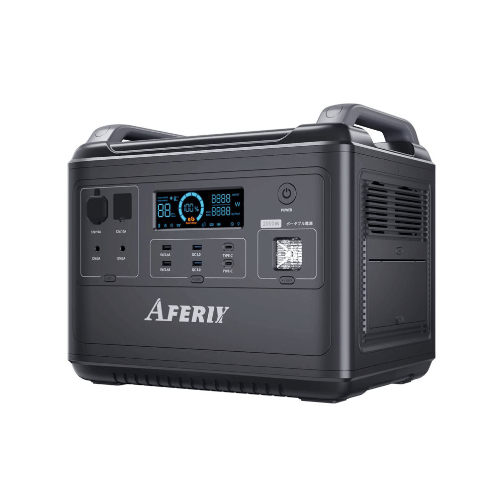 AFERIY2001Aポータブル電源は、1997Whの大容量、定格出力2000W(瞬間最大4000W)となっております。自己放電率が鉛蓄電池と比較し少ないため満充電後約2年間の電力維持が可能となり、キャンプ、車中泊、野外撮影などのアウトドアイベント、また災害や停電時の防災対策としてのバックアップ電源として活躍します。